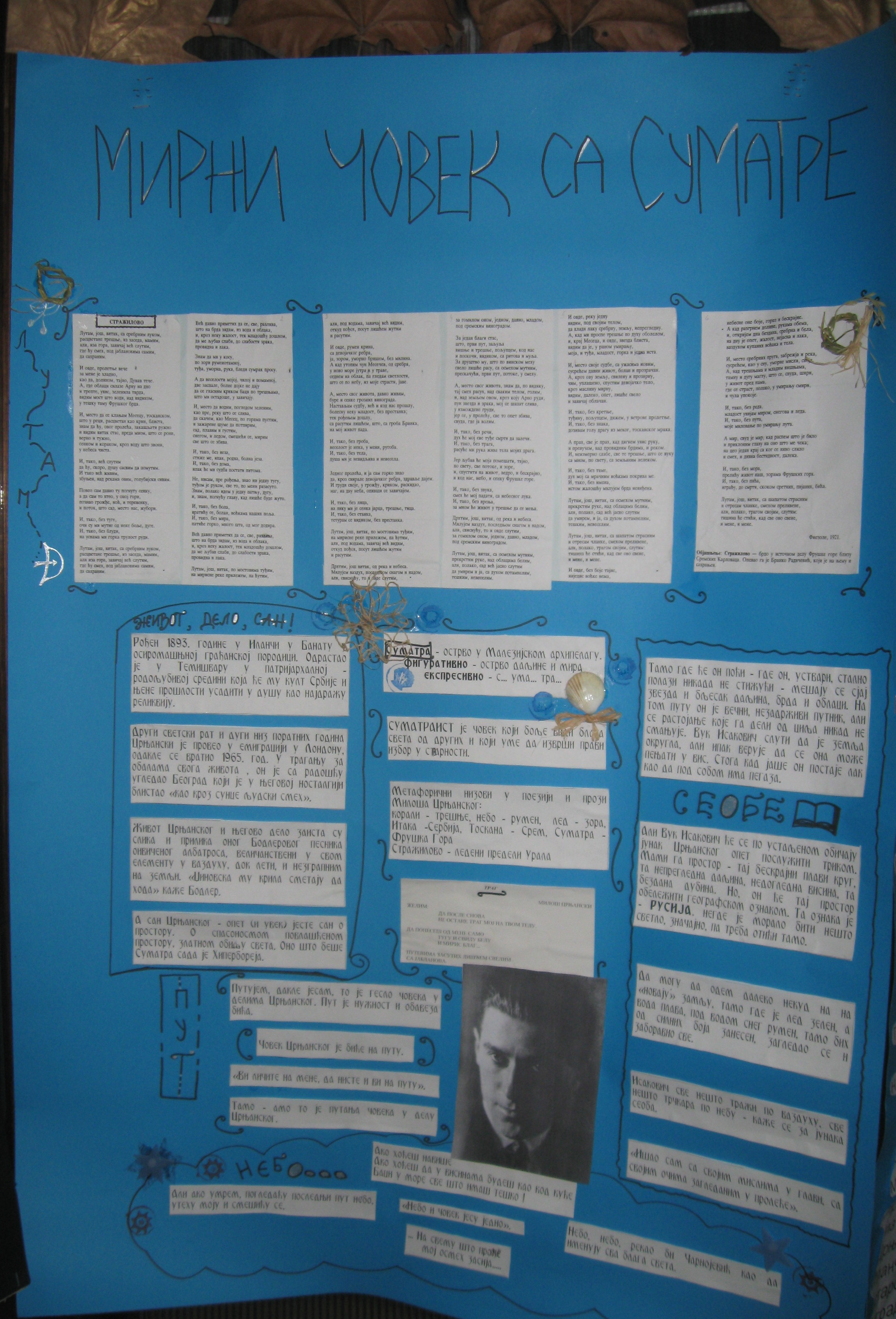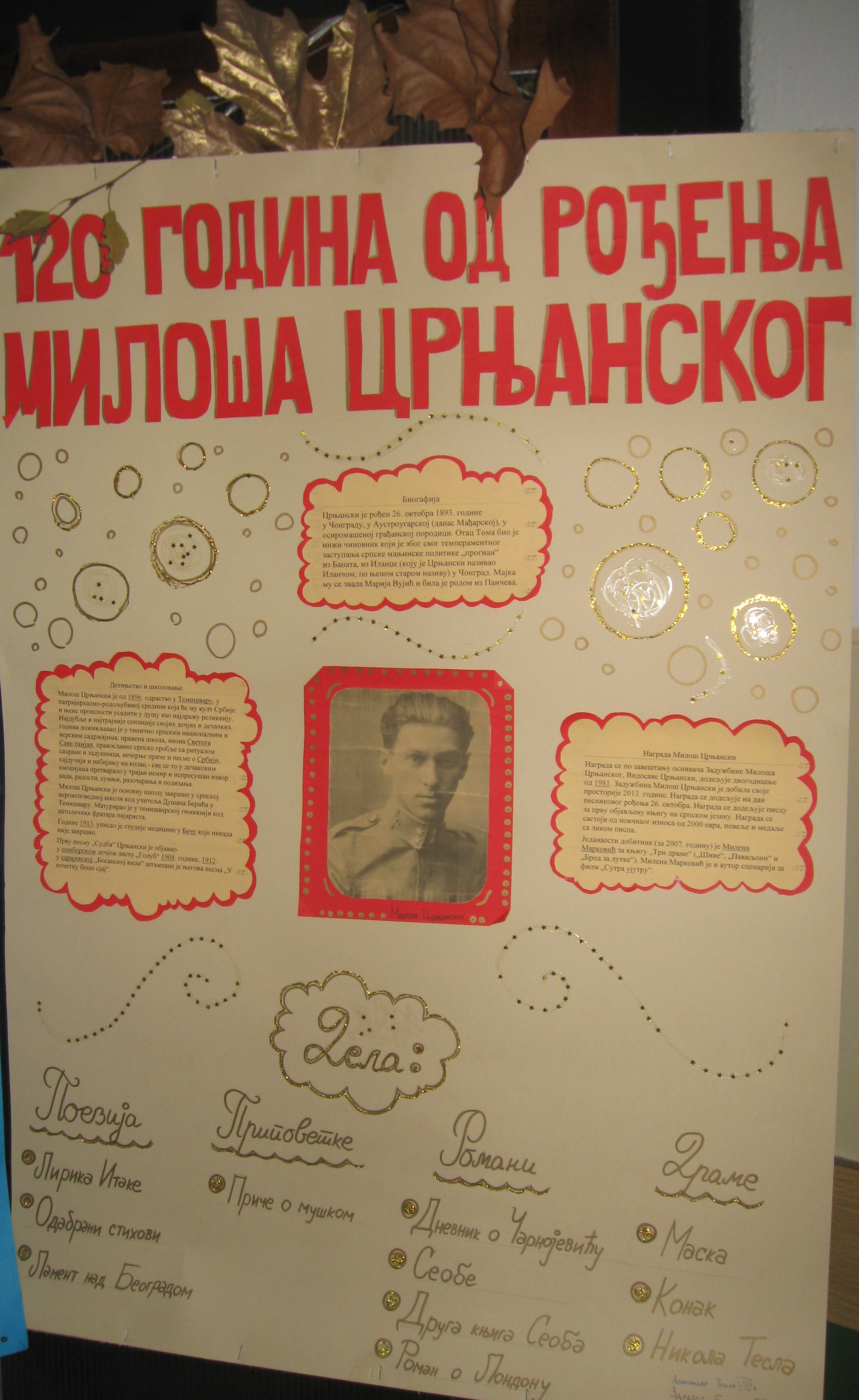 Последњег новембарског дана навршила се 37. година од смрти једног од највећих српских књижевника Милоша Црњанског. Литерарна секција Основне школе „Бранко Радичевић” Шид поводом тог јубилеја приредила је изложбу у холу матичне школске зграде.