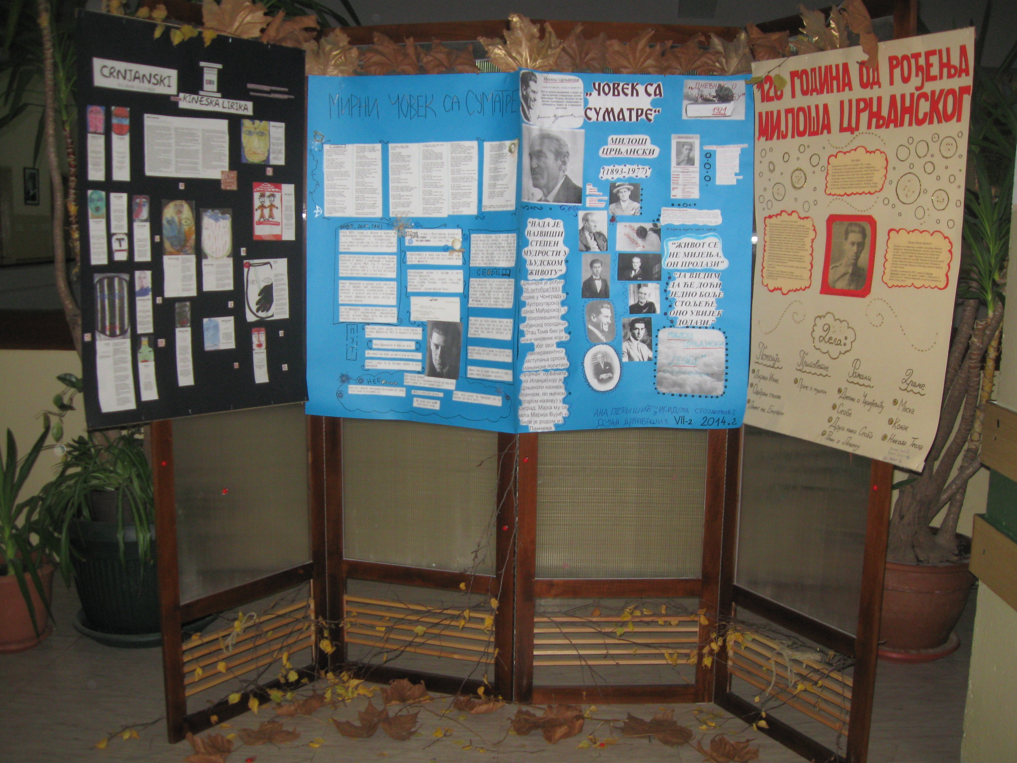 Изложба је, захваљујући креативним решењима ученика, на посве занимљив начин, приказала живот и дело овог уметника, са посебним освртом на цитате из књижевне критике. Осим тога, један део изложбе посвећен је преводилачком раду Милоша Црњанског и представља Антологију кинеске лирике, тј. њено специјално издање са преводима Црњанског и илустрацијама академске сликарке Биљане Вилимон, које је промовисано на овогодишњем Сајму књига у Београду.